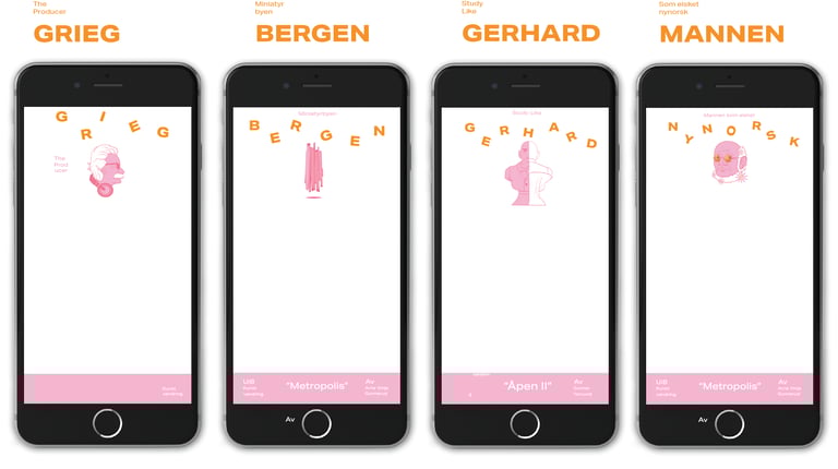 A project done in collaboration between me and Anny Follesøy, as part of our practice at Overhaus AS. This project was a mockup we made in response to UiB's request for new filters for the city's statues representing the university's greats, as well as works of art. Here we have tried to create an identity based on more humor and modern touch, with information about each statue. Our main goal was to present them in a modern way, so that those who use the geofilters will also get "lowkey" information about each statue. This prosject was created as a pitch.
